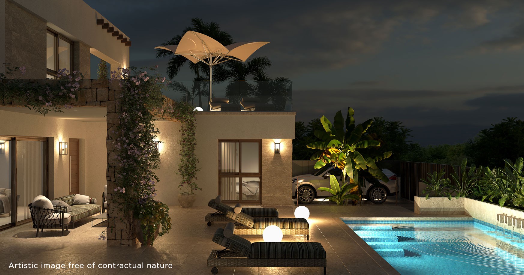 This villa is built to the highest standard and includes a private pool, all kitchen appliances, hot/cold air conditioning, under floor heating in the bathrooms, rooftop solarium and private parking.